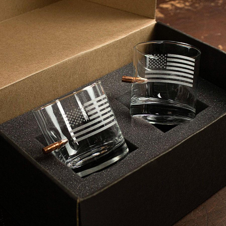 This 11oz whiskey glass is hand-embedded with a real, lead-free .308 caliber bullet and laser etched with a US Flag design.